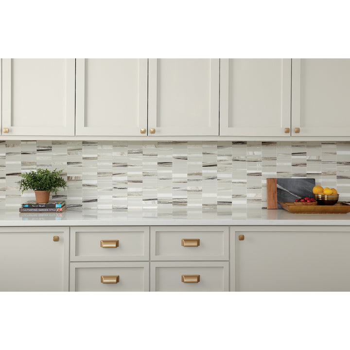 Simplystick Mosaix Daphne White mosaic features polished marble and glass blend—elegant and bright for modern interiors.