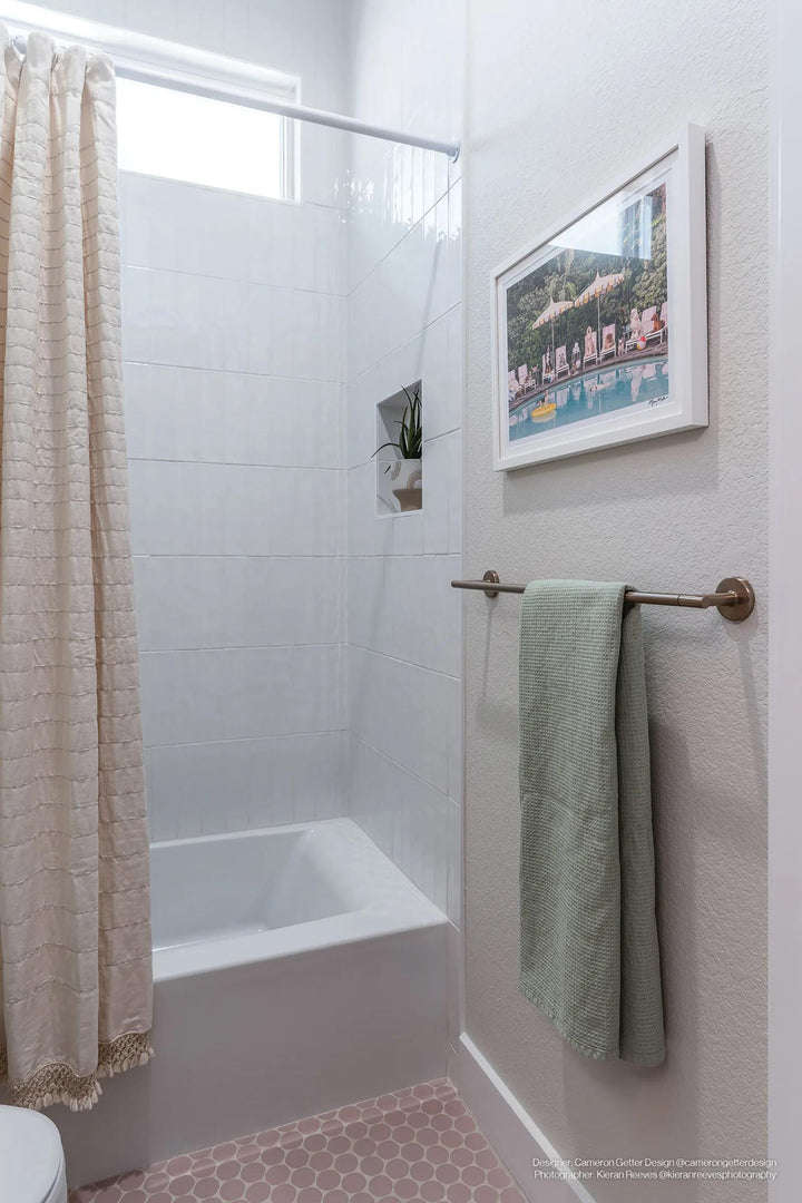• A beautifully neutral-toned interior featuring Clara White 2.75X11 Matte Glazed Porcelain, adding a soft and elegant texture.