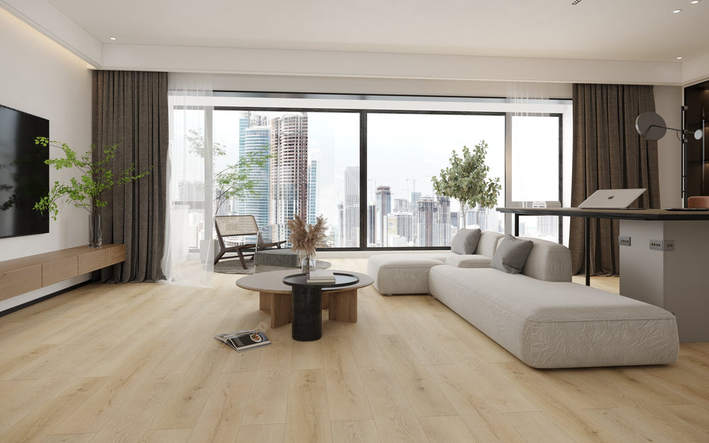 Maison Deux Engineered Hardwood shown in a modern interior, emphasizing soft neutral tone and smooth finish.