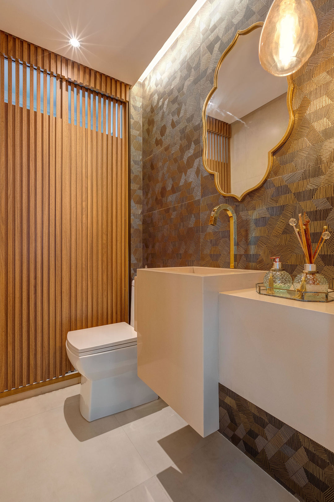 Gold-toned shimmer from the Aurora Gold 12x36 Metallic Ceramic Tile enhances the overall scene, offering both visual warmth and reflective texture.