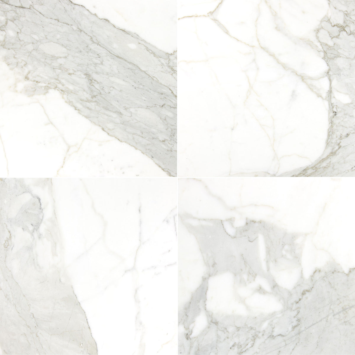 • Wide view of Calacatta Gold Marble 18X18 honed tiles, showing tone variation and natural stone character.