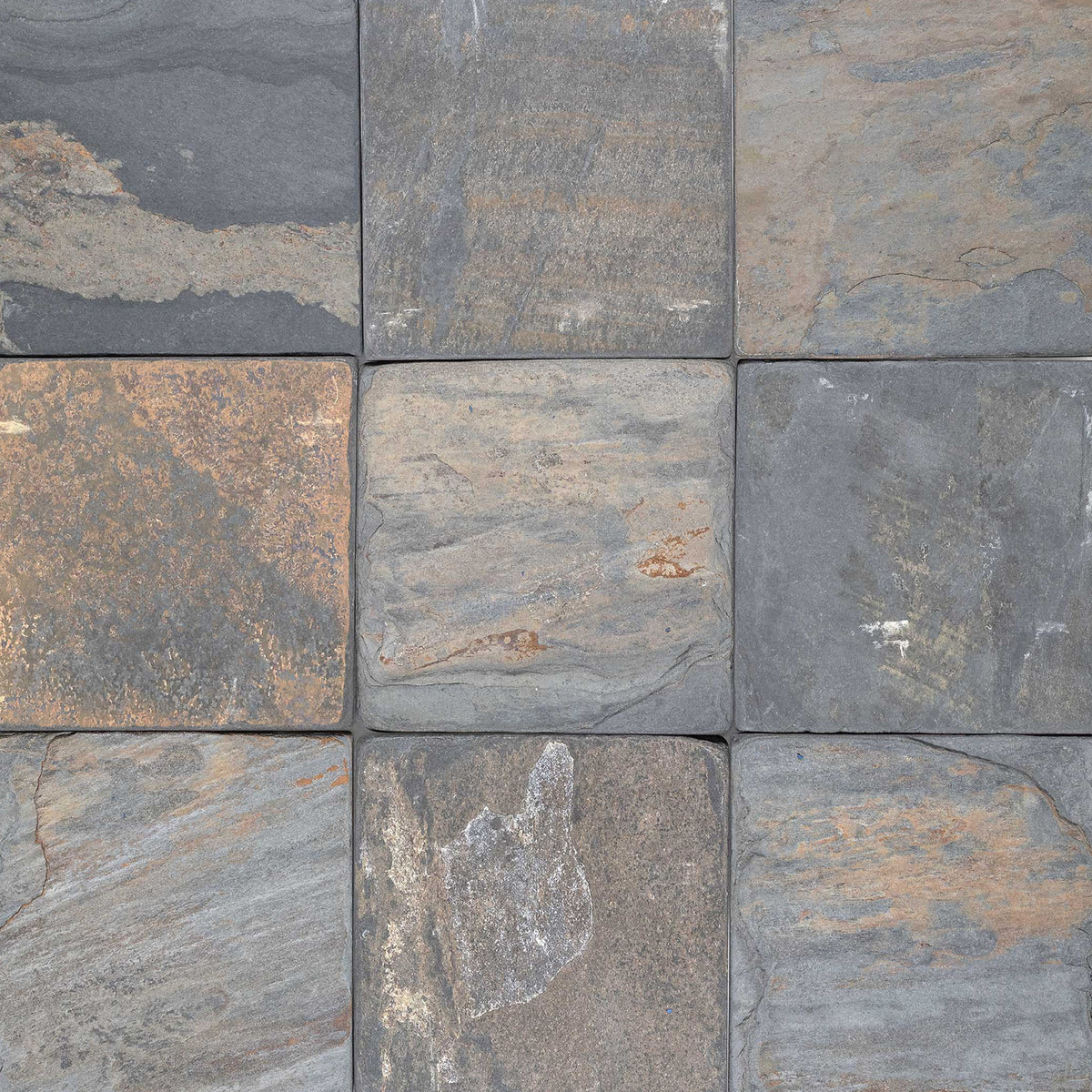 The California Gold 6x6 tumbled slate tile showcases a blend of warm golds, browns, and greys, creating a naturally weathered effect. Its versatile size works well for accent walls, fireplace surrounds, and patterned floor designs.