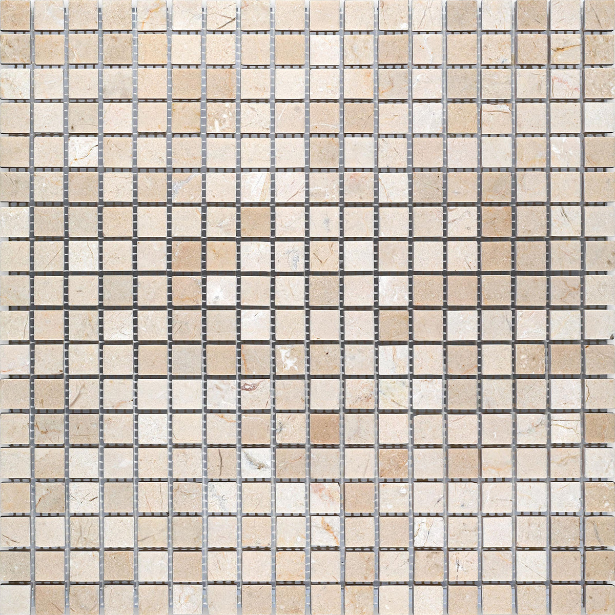 This 5/8-inch honed square mosaic, laid on a 12x12 sheet, showcases a structured, grid-like arrangement with a soft matte texture. The natural finish highlights the warm beige tones of Crema Marfil, making it an excellent option for classic and contemporary designs.