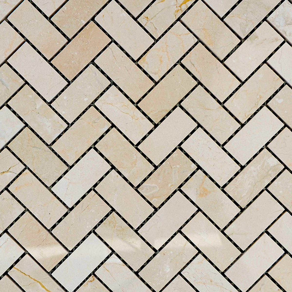 This 1x2 polished herringbone mosaic, structured on an 11-1/8 x 11-3/8 sheet, highlights the elegance of Crema Marfil marble with a radiant, reflective surface. The polished finish enhances the veining, adding a luxurious touch to any room.