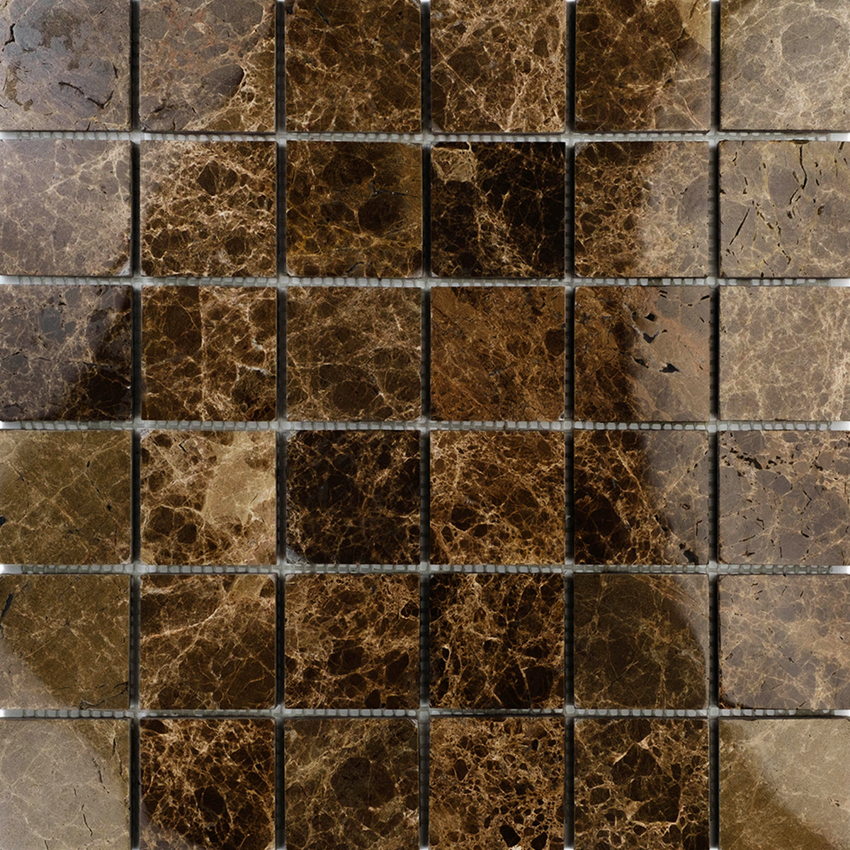 Larger proportions define the 2-inch polished square Emperador Dark marble mosaic, which enhances spaces with its bold, structured design. The glossy surface emphasizes the stone’s natural veining, creating a luxurious and sophisticated effect.