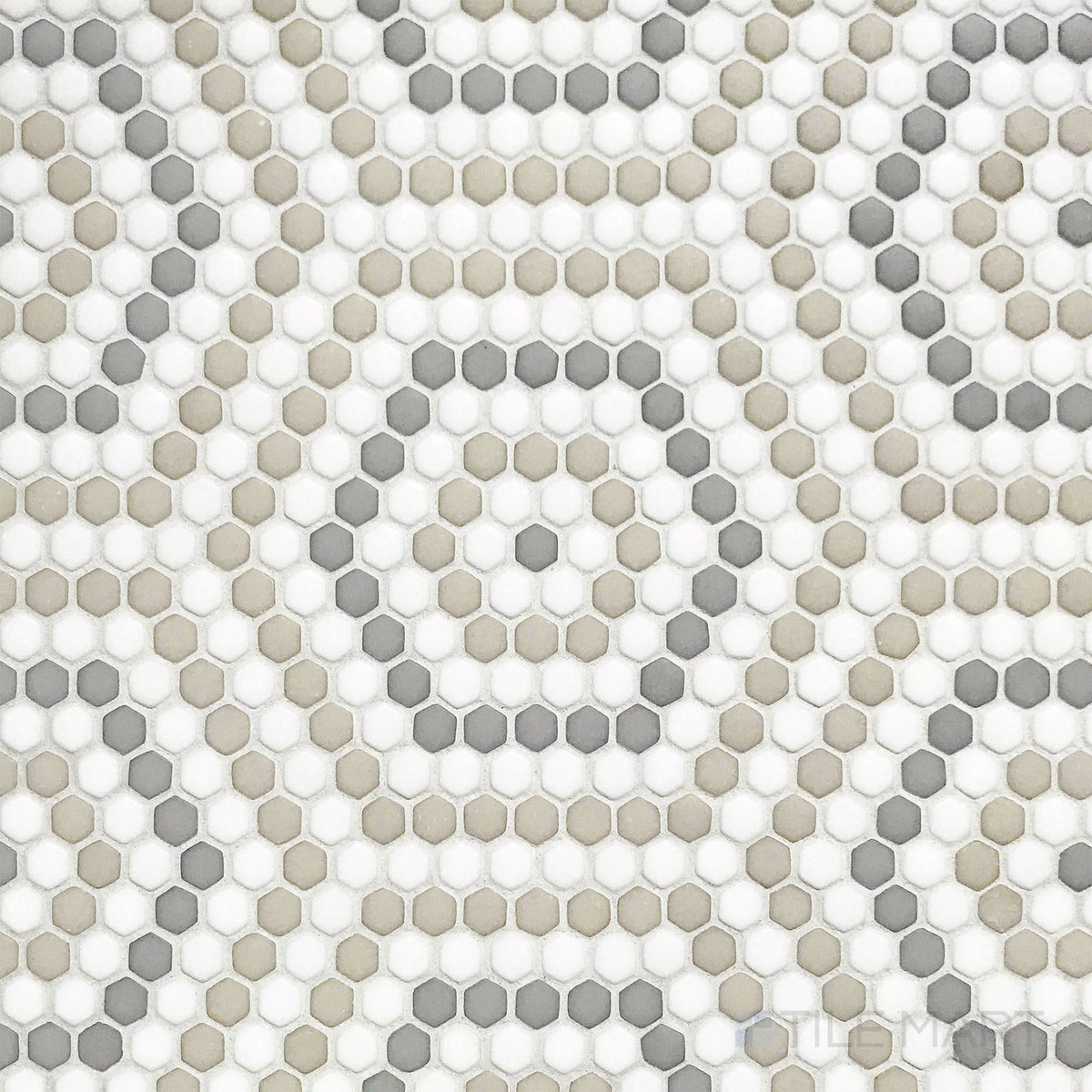 The Geometro Belfort Country mosaic combines earthy tones with a sleek hexagonal design, made from recycled glass. Its matte finish and 10-3/4" x 14" size create a rustic yet refined look suitable for any setting.