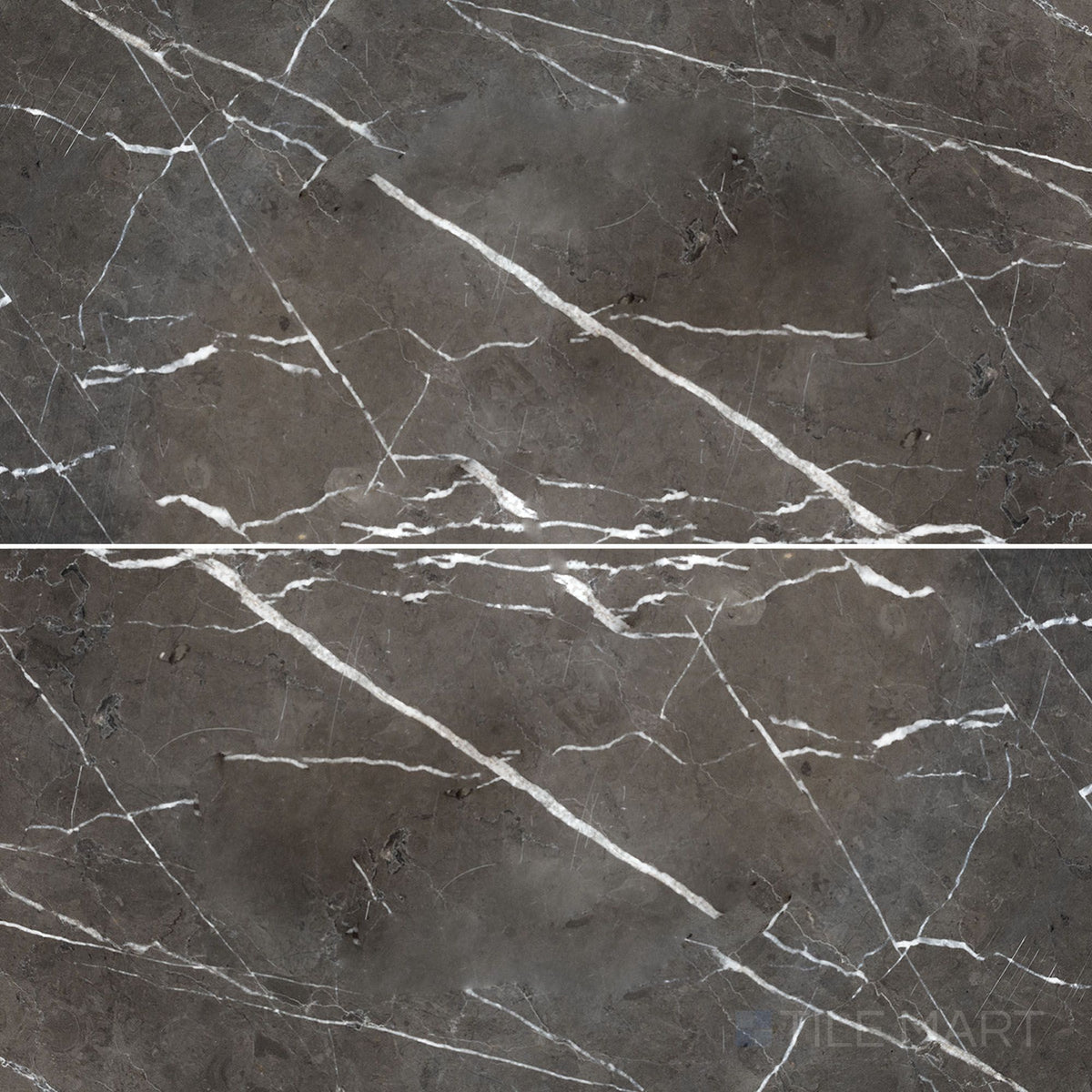 • Close-up of Graphite Marble 12X24 Polished Tile, highlighting its sleek surface and rich, graphite hues with intricate natural veining.