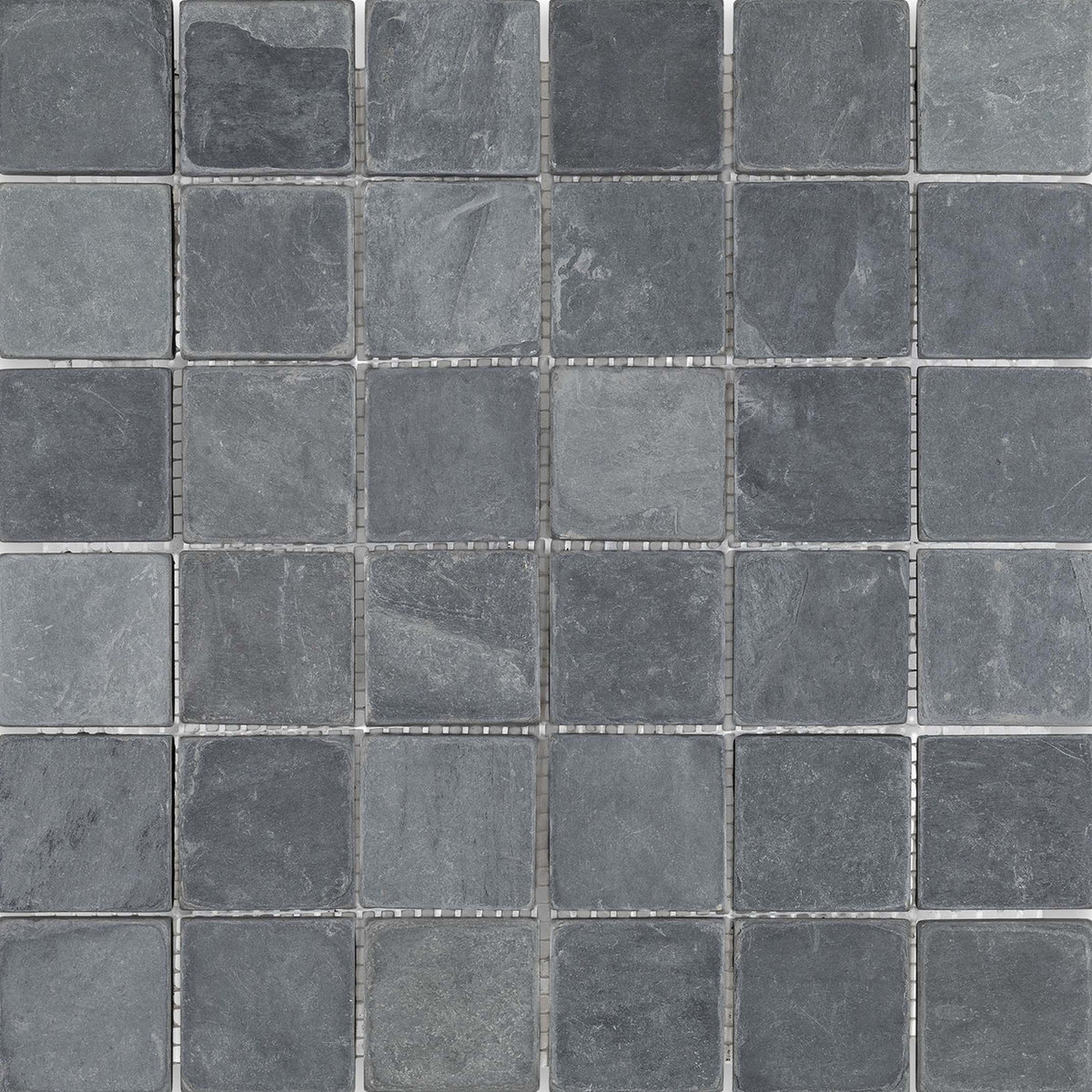 The Indian Black 2" square mosaic tile offers a timeless grid pattern with a naturally weathered tumbled finish. Pre-mounted on a 12x12 sheet, this versatile slate mosaic is perfect for accent walls, shower floors, and decorative inlays, adding texture and depth to any space.