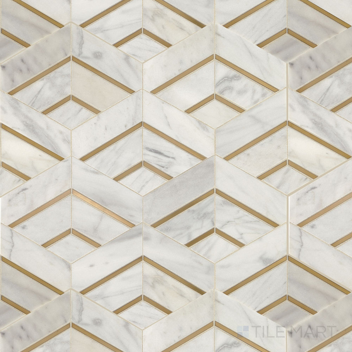 Shown in its entirety, the Lavaliere Alluring White and brass intermix honed marble mosaic highlights a layered decorative pattern