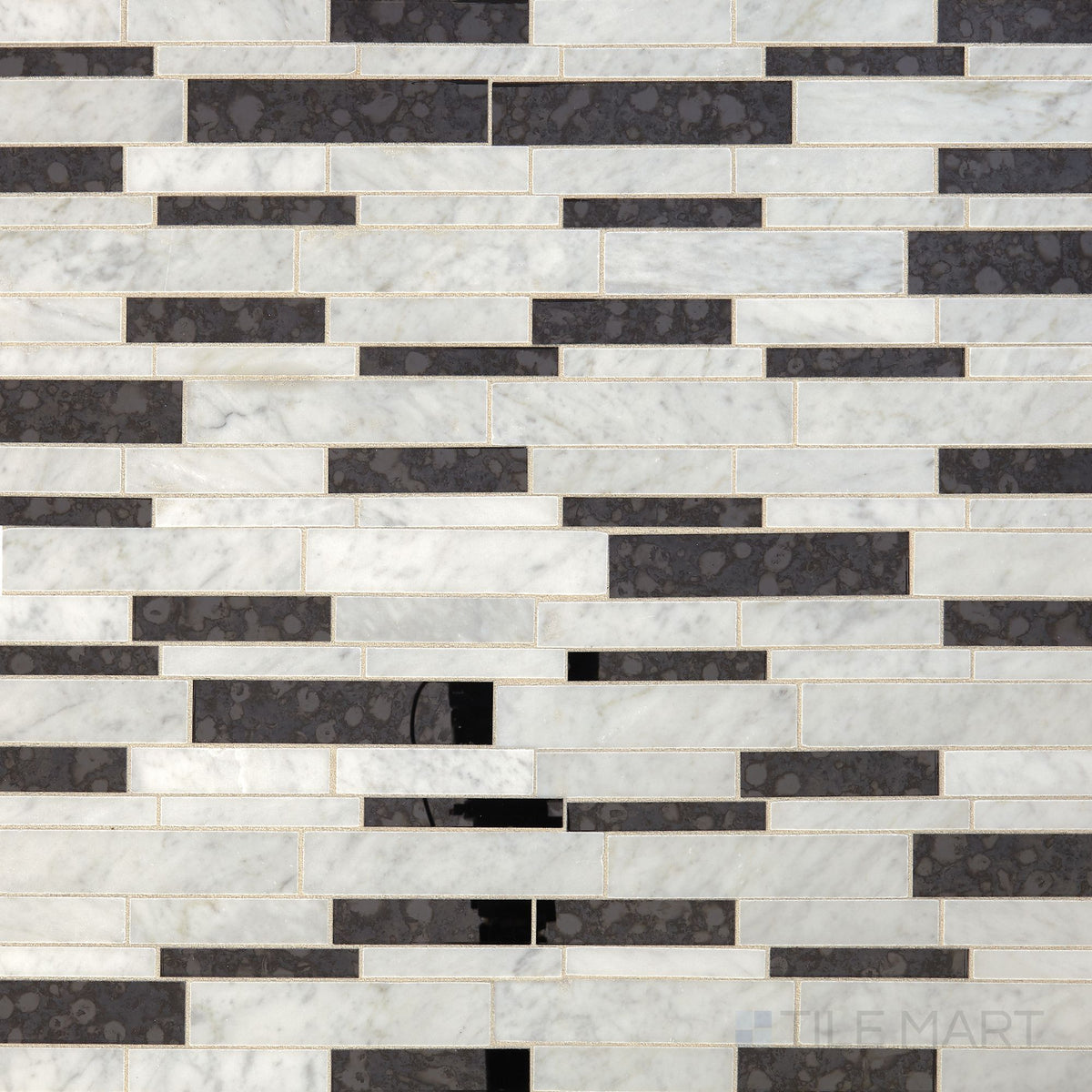 Lavaliere Random Linear mosaic pairs Carrara white marble with black mirror accents for a modern, polished finish and visual dimension.