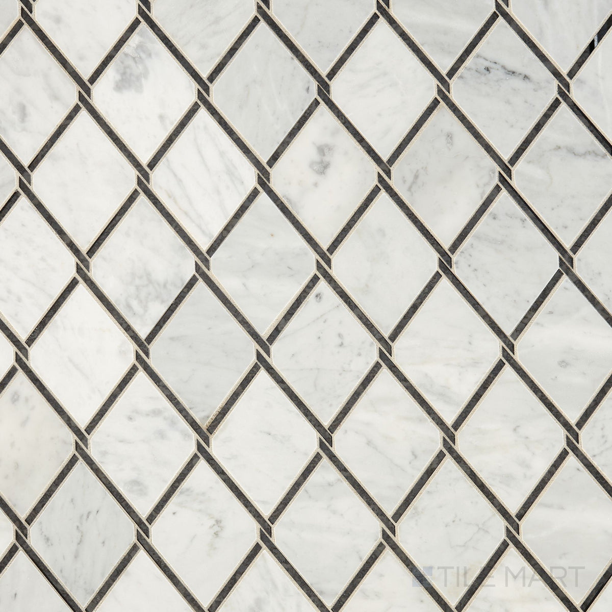 Carrara and black ant mirror form a bold link pattern in Lavaliere’s Chain Link mosaic, polished to enhance visual rhythm and shine.
