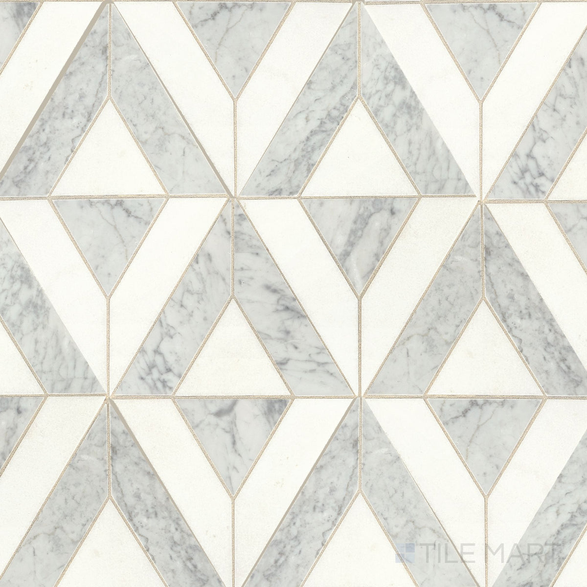 • A stunning contrast of First Snow marble and brass diamond accents creates a striking and modern aesthetic in this Lavaliere First Snow Elegance/Brass Diamond polished marble mosaic.