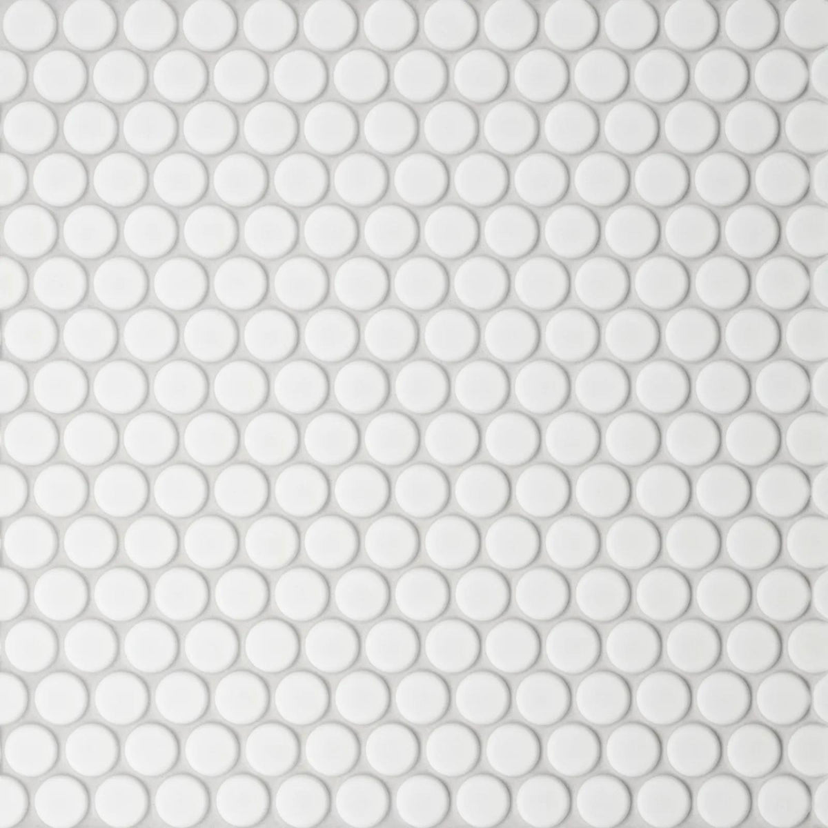 Le Café White 3/4" Penny Round matte mosaic delivers crisp brightness and classic appeal with its vintage tile silhouette.