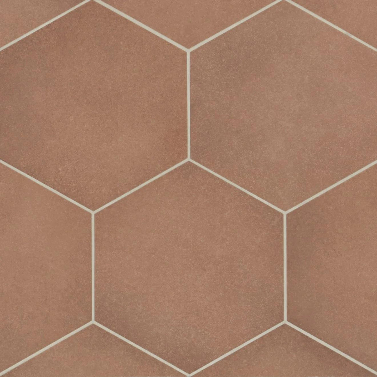 Makoto Umi Terracotta 10" hex tile offers rich terracotta warmth with a soft surface texture in a distinct geometric form.