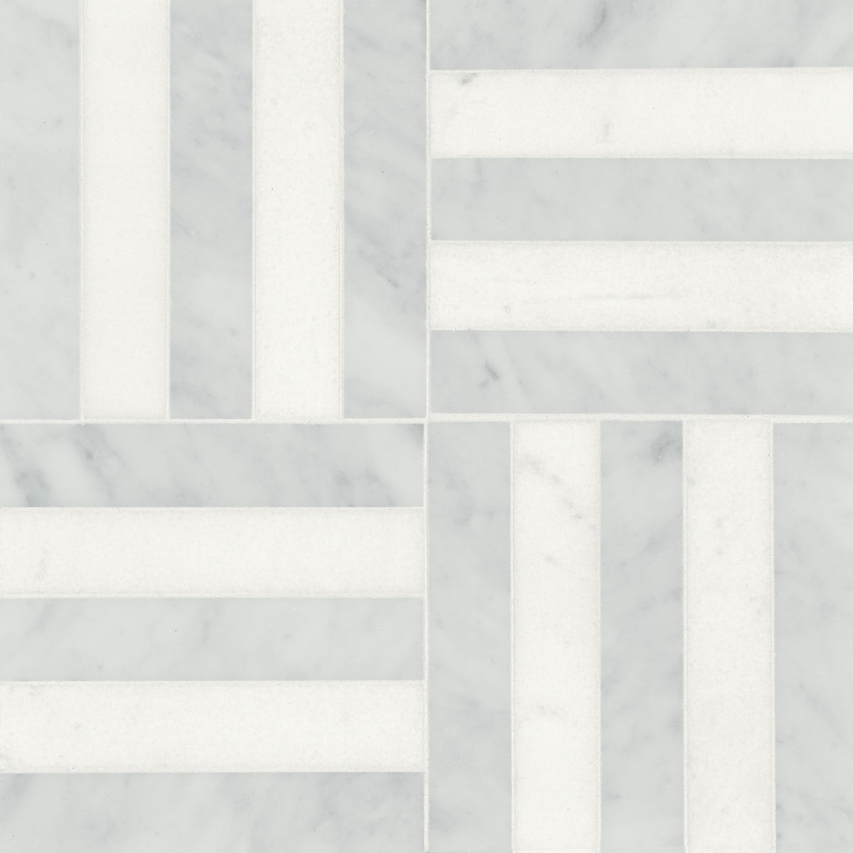 Graceful yet modern, Matisse Carrara & Thassos Honed Mosaic highlights a fresh white-on-white look with subtle veining and polished geometry.