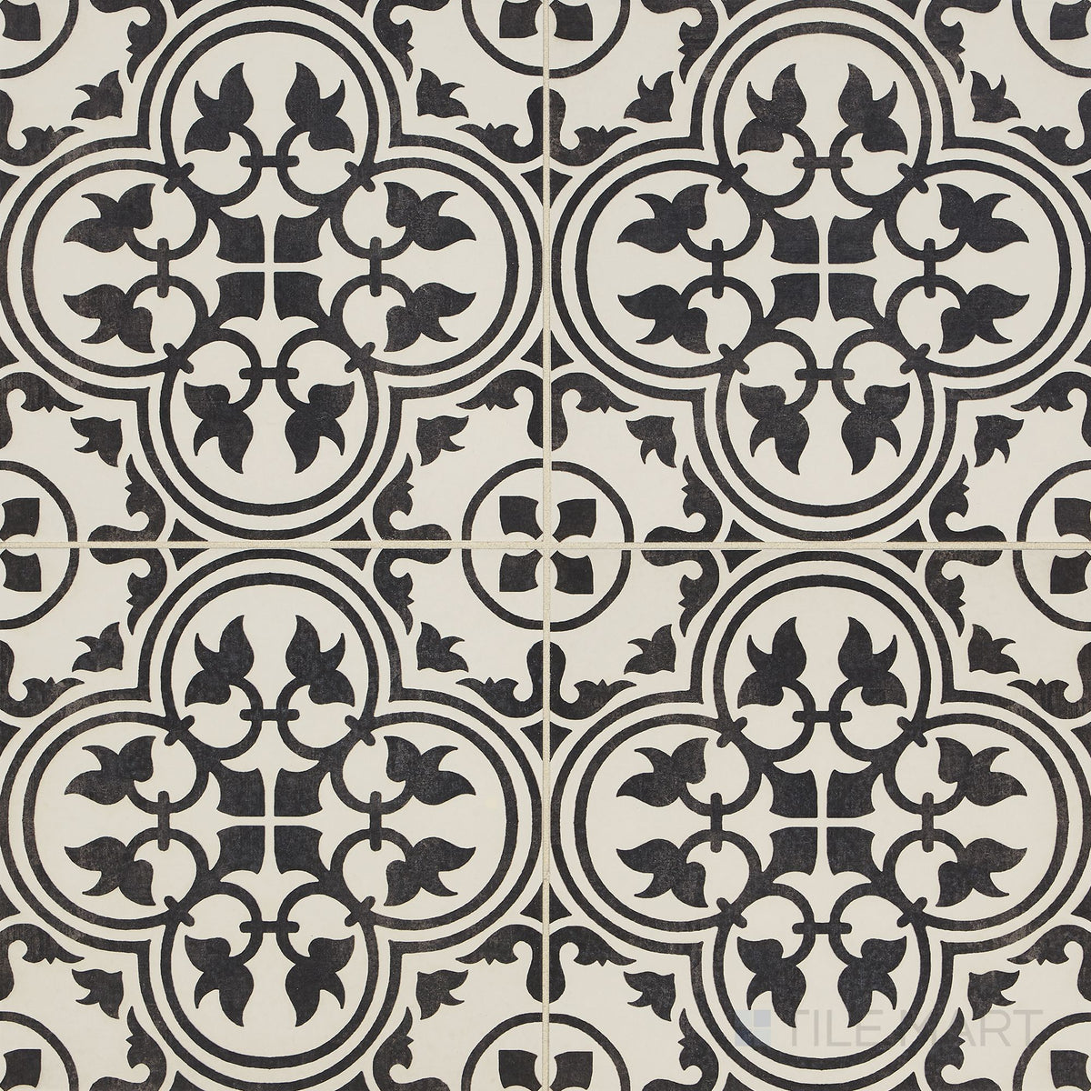Memoir Petal Black 12x12 matte ceramic tile creates moody elegance with floral motifs etched in a rich, dark palette.