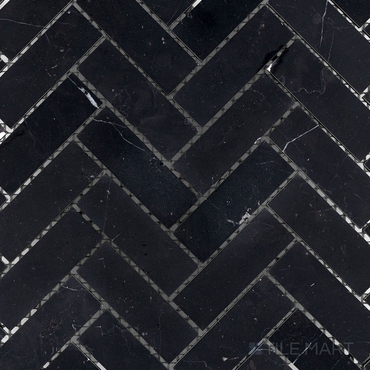 The Negro Marquina Mosaic in honed finish enhances spaces with its bold 1x3 herringbone design. 10-1/2x12-7/8 size provide a refined, textured look.