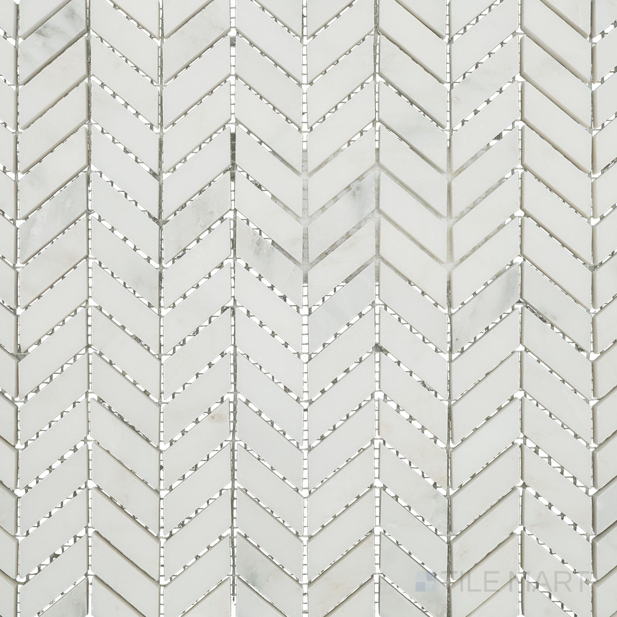 The Marble Oriental White Mosaic in honed finish combines subtle tones with intricate details. Its Chevron design and 12-3/8x12-3/8 layout create a harmonious and balanced aesthetic.
