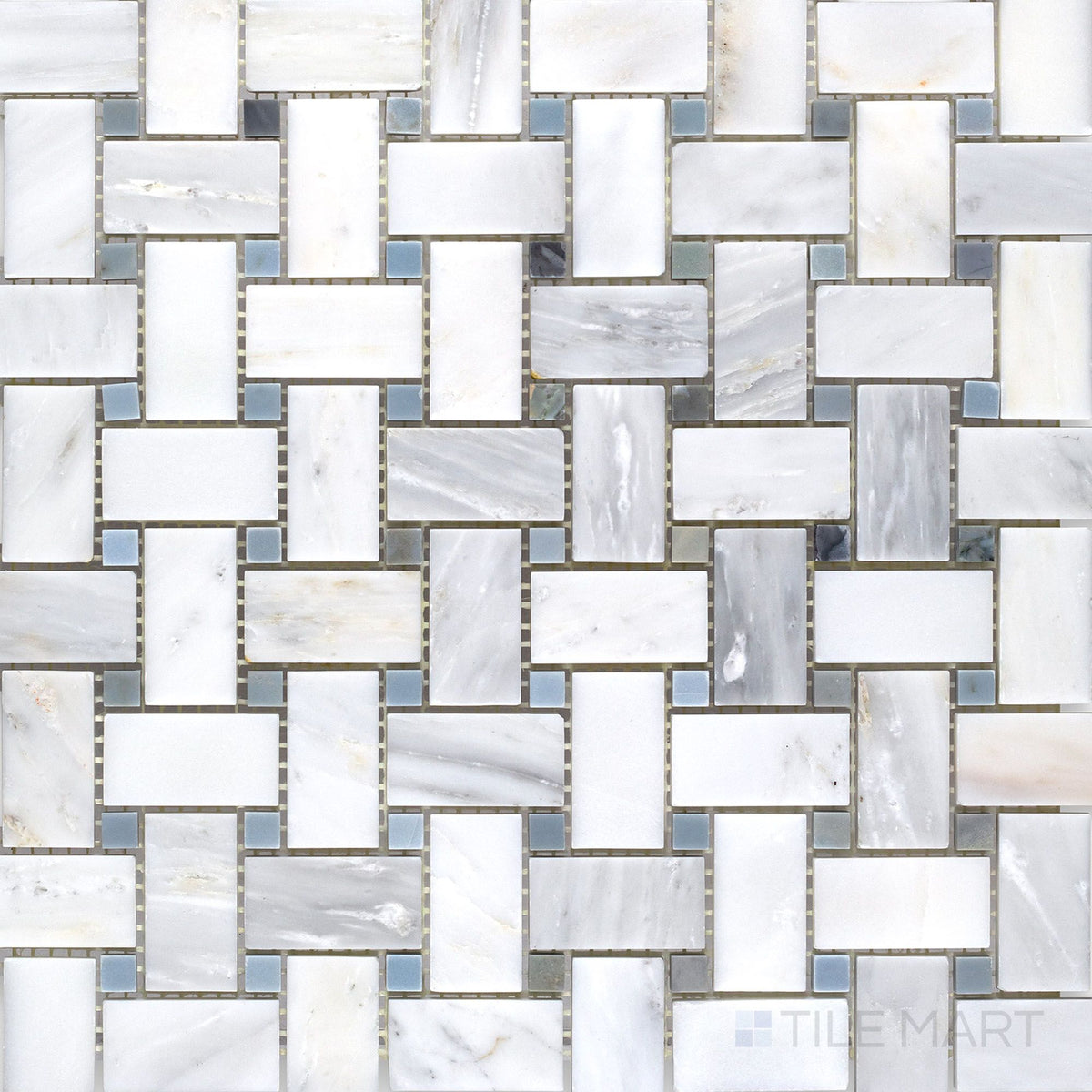 Oriental White Marble Basketweave W/ Blue Dot Honed Mosaic