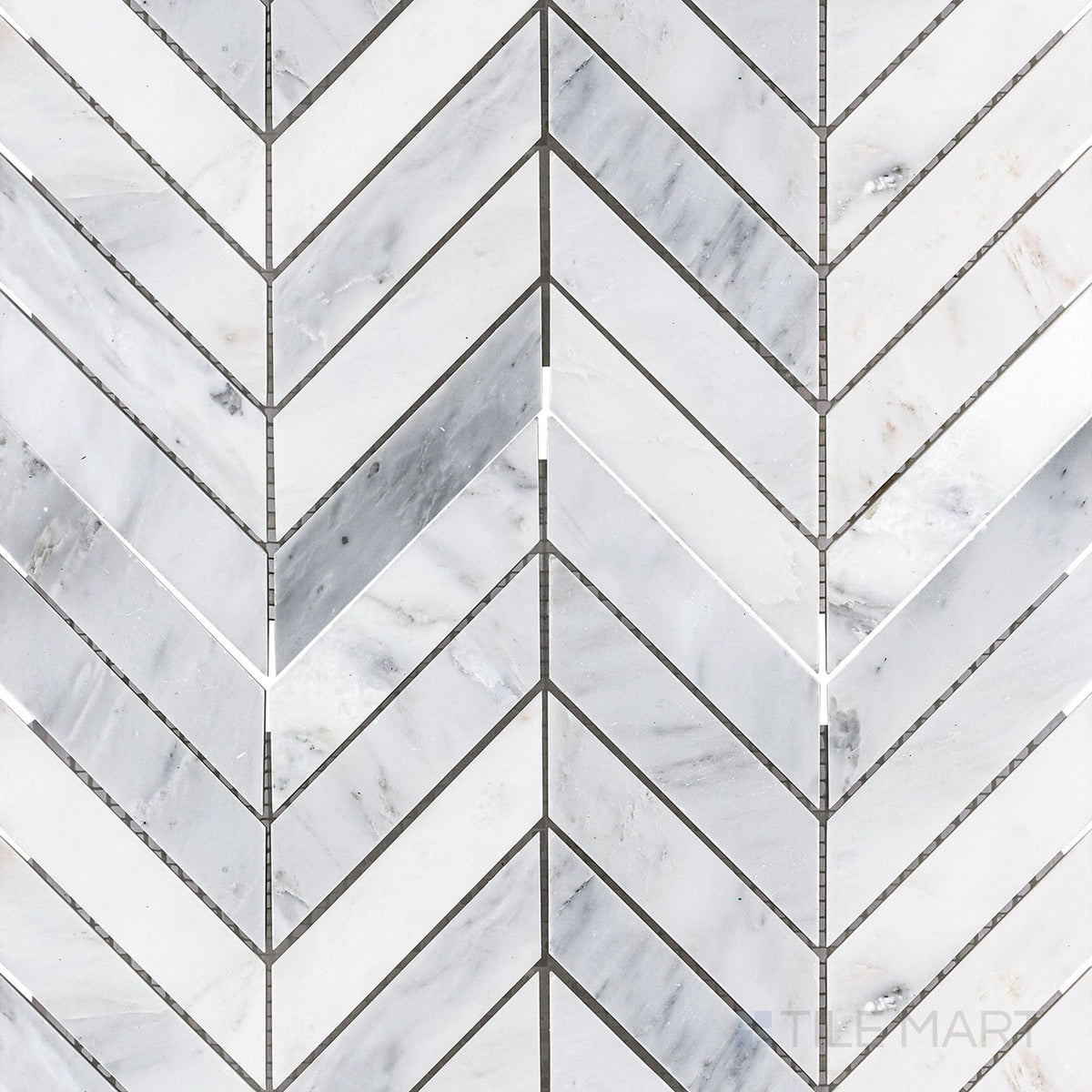 The Marble Oriental White Mosaic in honed finish delivers a clean, classic look. Its 1x4 Chevron pattern and 9x12 layout provide a sense of movement to any surface.