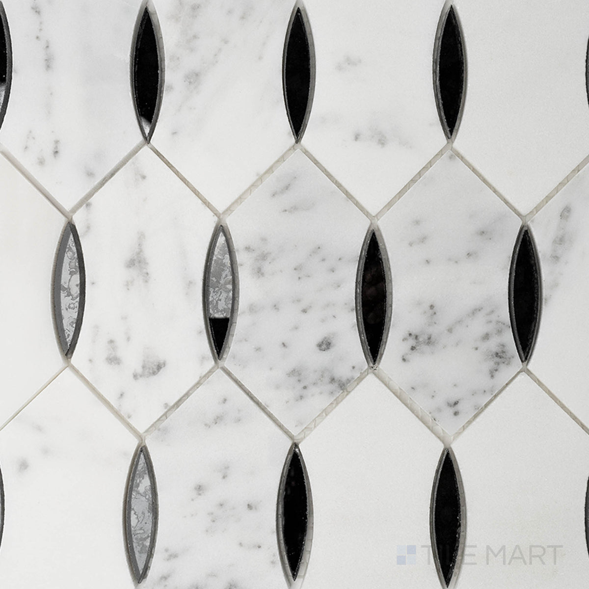 Create a striking visual impact with the Skye Noir Black and White Mosaic Tile from the Panache collection by Anthology Tiles. This polished stone tile features a bold waterjet pattern in black and white, making it perfect for backsplashes, fireplaces, and interior walls. Its classic and trendy design adds a dramatic touch to both residential and commercial spaces.