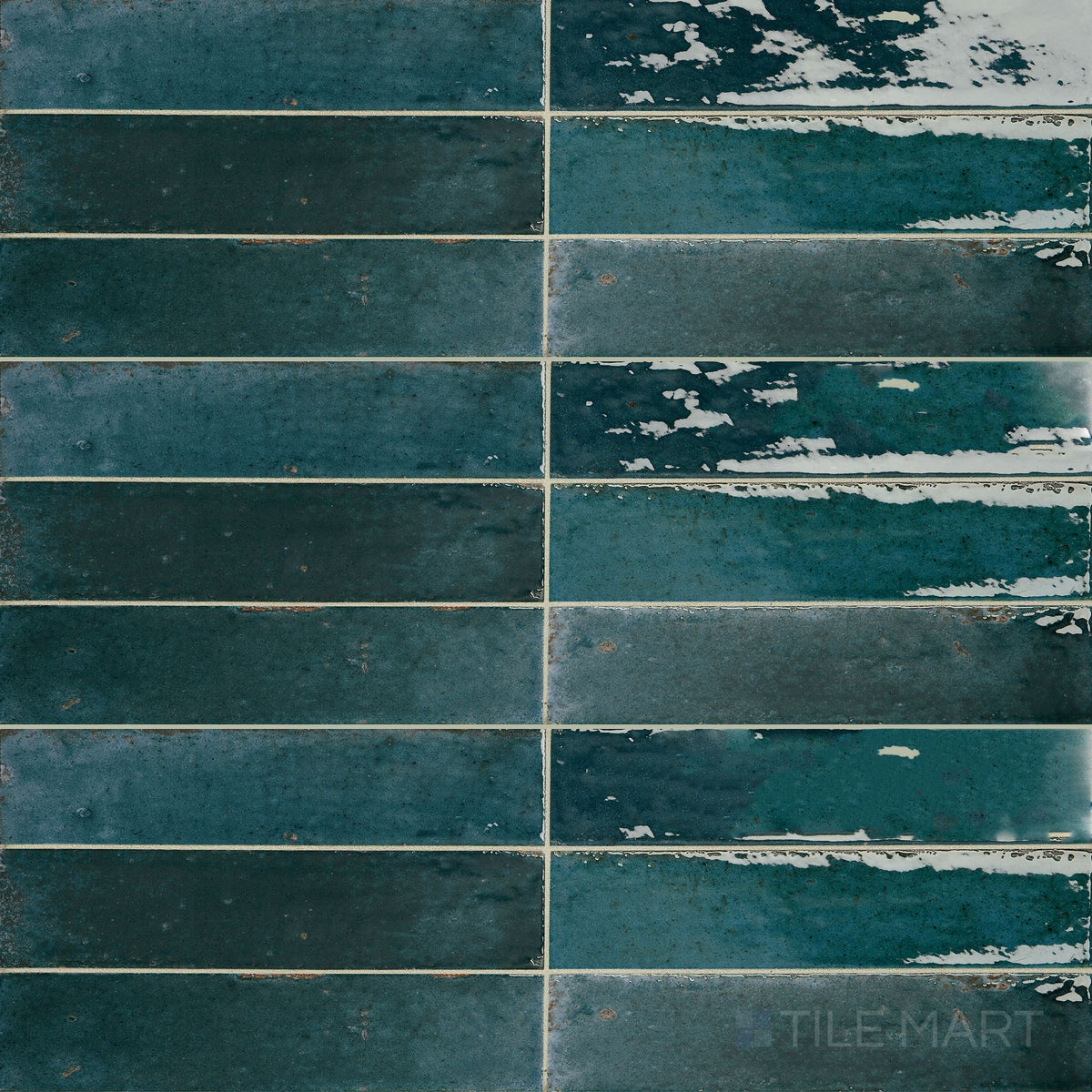 Close-up corner shot of Remedy Hydro 2X10 Glossy Glazed Porcelain, featuring its deep aquatic hues with a polished sheen.