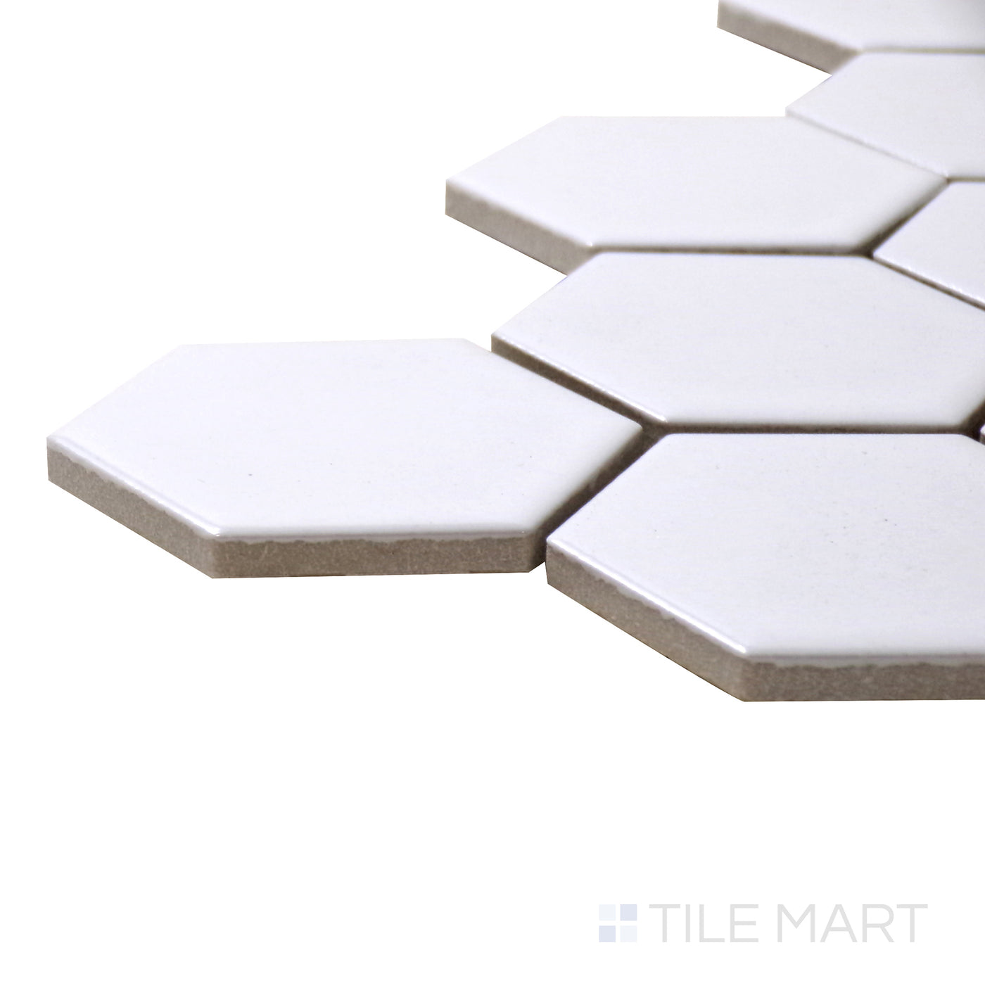 Diagonal view of Retro White 2" hexagon glossy porcelain mosaic, showcasing its crisp white tone, reflective glossy finish, and a structured hexagonal layout.
