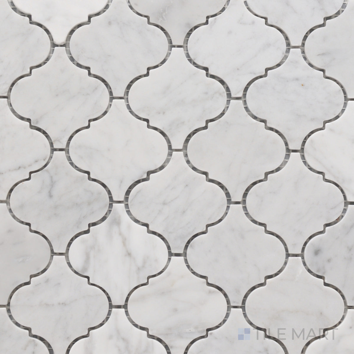 Rockart Carrara Marble Lantern Mosaic captures Moroccan-inspired curves in premium Carrara marble—ideal for decorative walls with global flair.