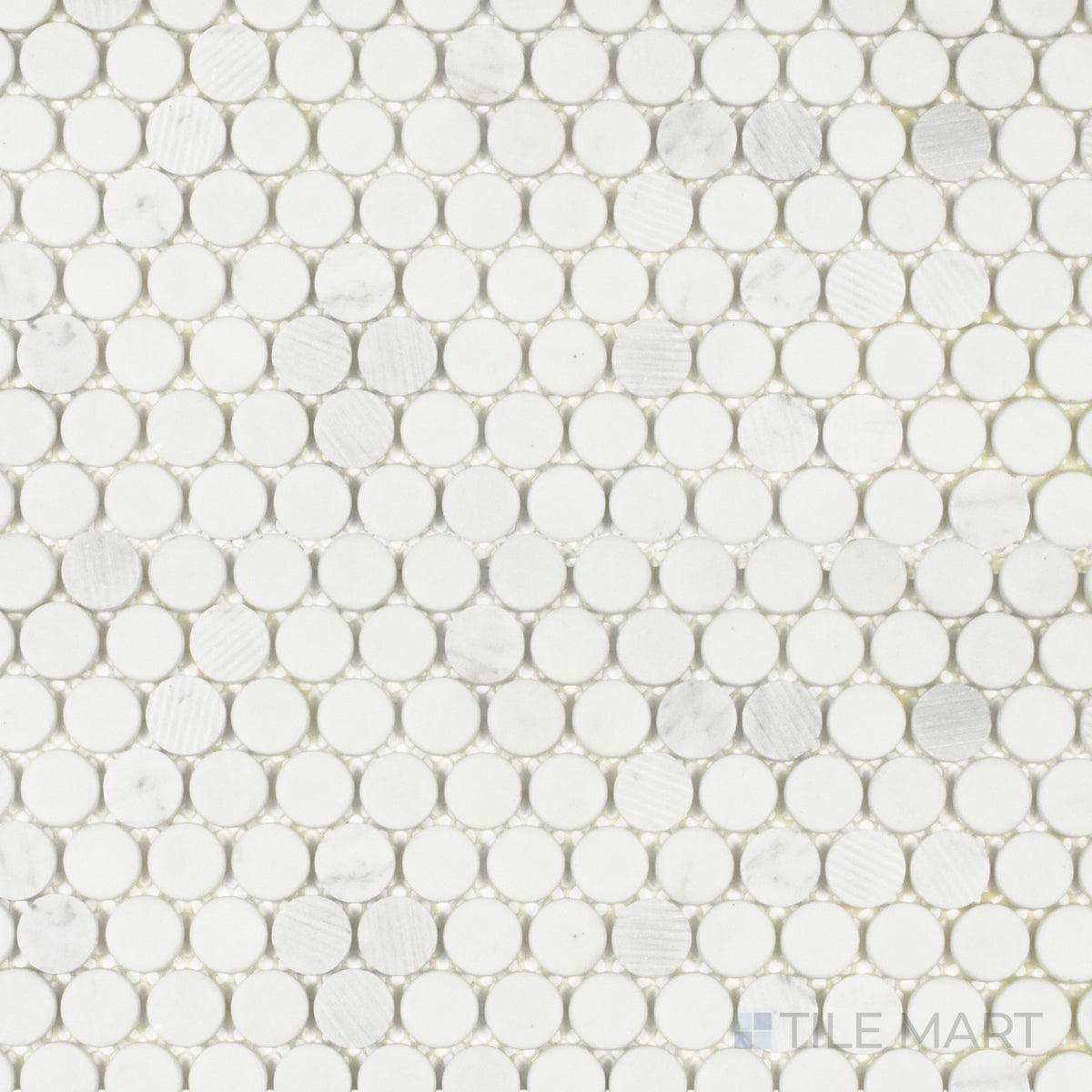 Rockart Carrara Penny Round Matte And Polished Marble, Recycled Glass Mosaic