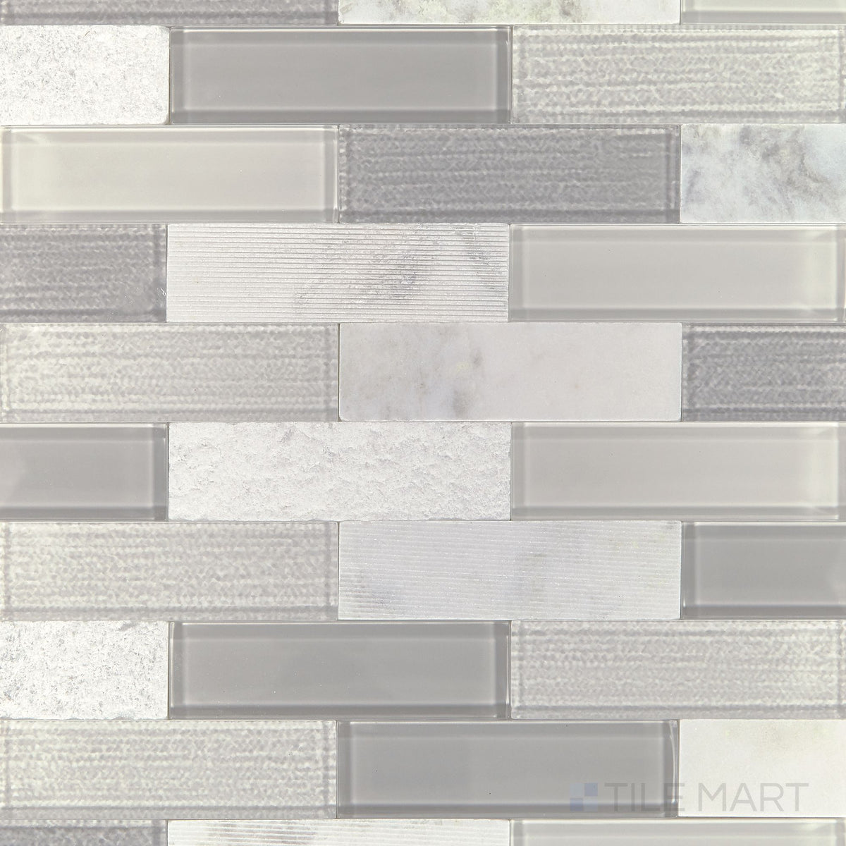 Simplystick Mosaix Daphne White mosaic combines honed and polished finishes in a stunning marble-glass fusion.