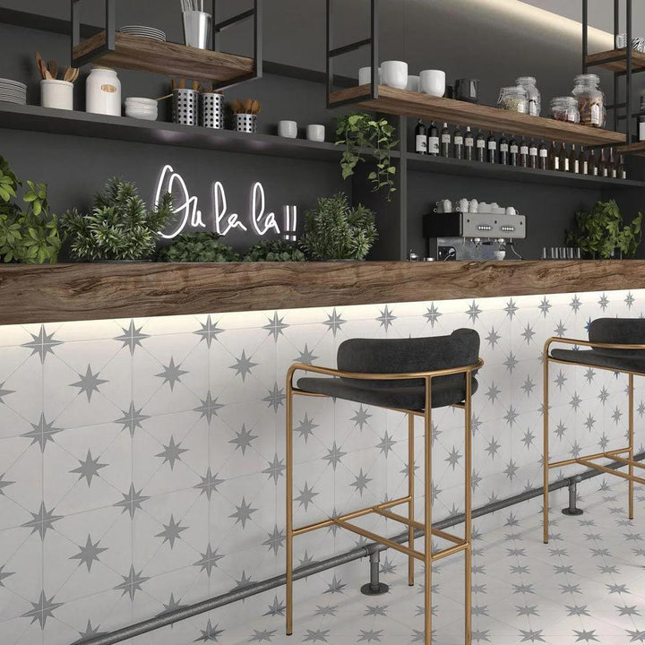 Starburst Llevant Grey 9x9 matte porcelain tile brings subtle movement and cool tones to contemporary interiors.