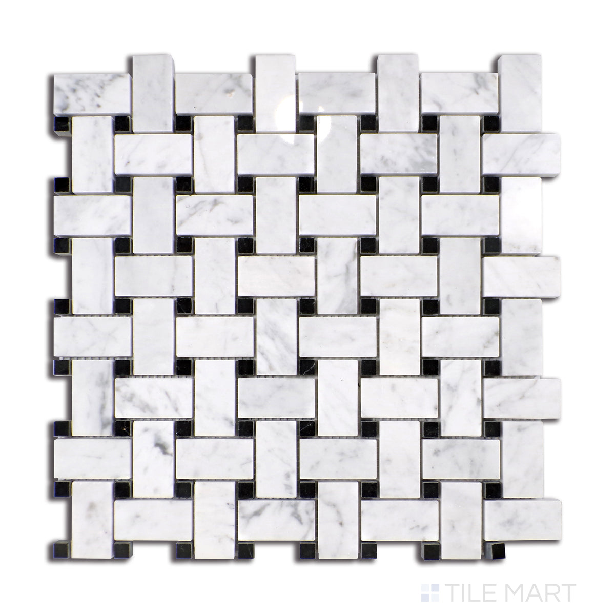 This polished basketweave contrasts Carrara’s soft veining with dramatic black dot insets, offering refined dimension in classic style.