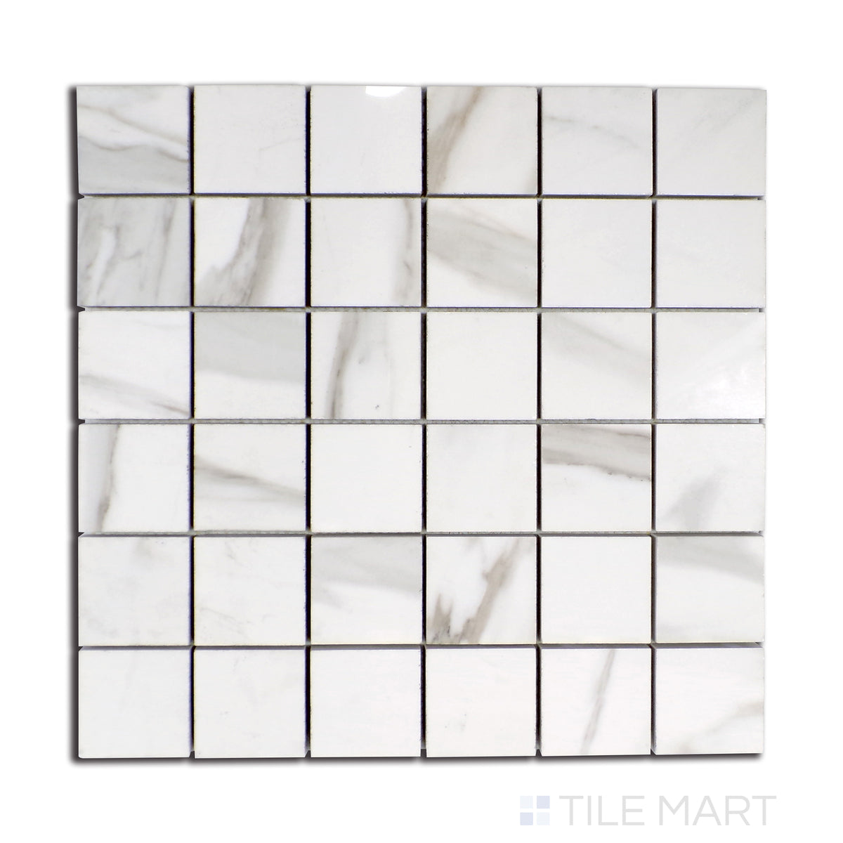 Tele Di Marmo Reloaded Calacatta 2" square polished porcelain mosaic delivers crisp veining and a glossy marble effect in a classic grid.