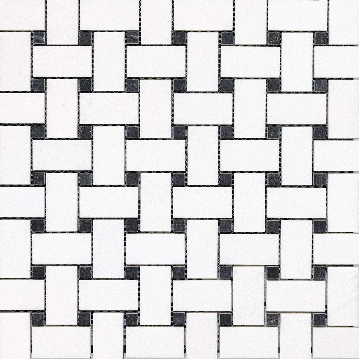 Thassos White Marble Basketweave W/ Black Dot Honed Mosaic