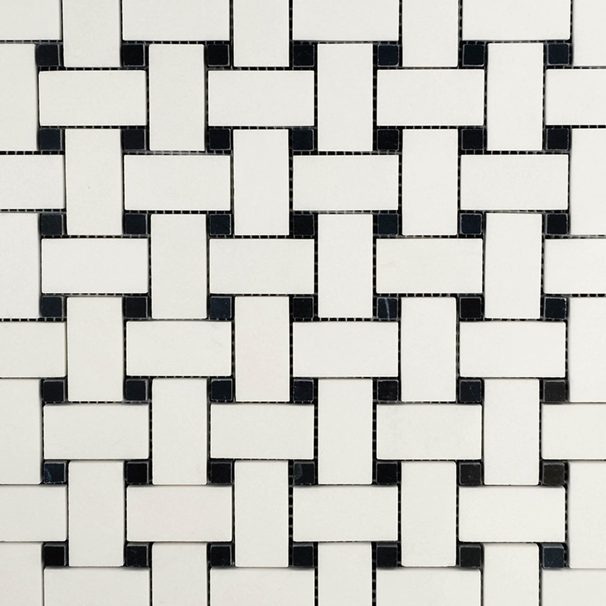A polished finish highlights the refined beauty of the Thassos White basketweave mosaic with black dot. The glossy surface enhances the visual contrast, bringing depth and dimension to both traditional and modern interiors.