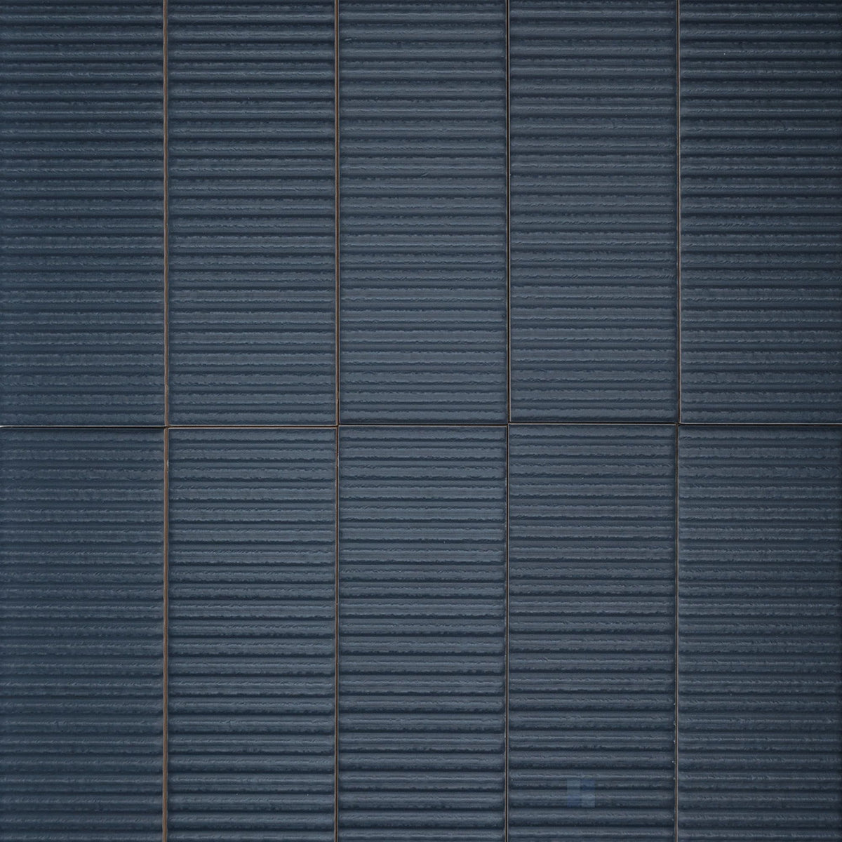 • Van Decor Azul 3x12 Matte Ceramic Tile styled with rich blue tones and decorative embossing that brings energy and texture to vertical surfaces.
