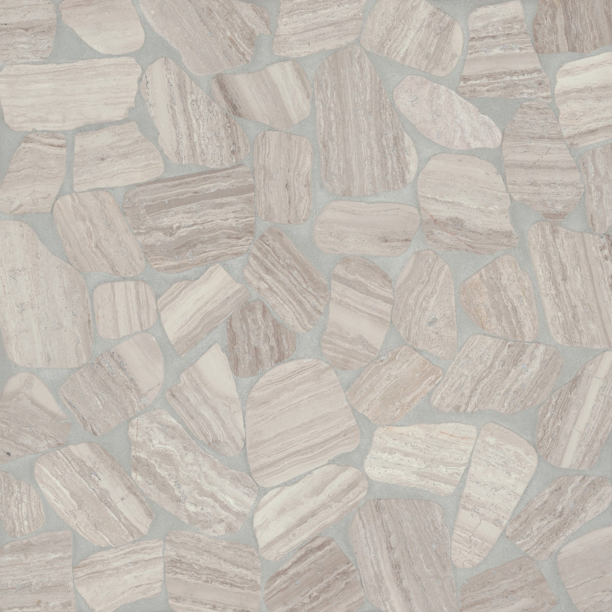 Waterbrook Ashen Grey sliced pebble mosaic offers a soft, weathered stone appearance ideal for spa-like surfaces.