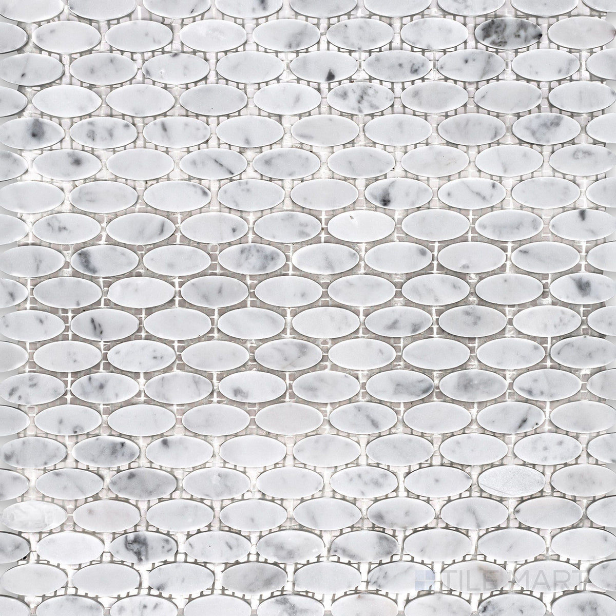 The honed finish of this oval White Carrara marble mosaic gives it a soft, organic appeal while maintaining a structured elegance. The 11-1/2x12 sheet layout creates a fluid movement, making it an ideal choice for sophisticated flooring, backsplashes, and feature walls.