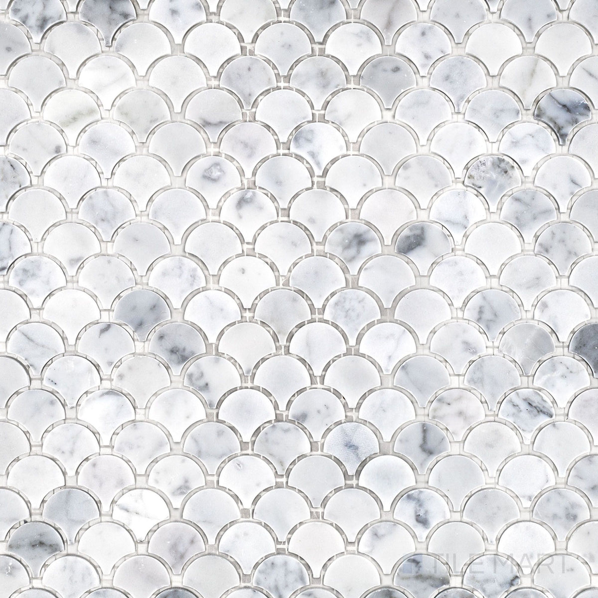 The 1" fan pattern in honed White Carrara marble creates a flowing, scalloped design with a soft, matte texture. The 11-1/8x11-3/4 sheet is ideal for elegant walls, statement backsplashes, and decorative accents.