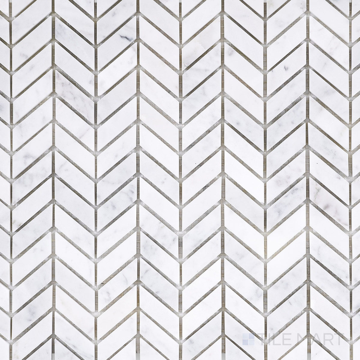 The 5/8x1-1/4 chevron mini pattern brings a dynamic, polished look to this White Carrara marble mosaic. Arranged in an 11-1/2x12 sheet, it adds texture and style to backsplashes, accent walls, and elegant bathrooms.