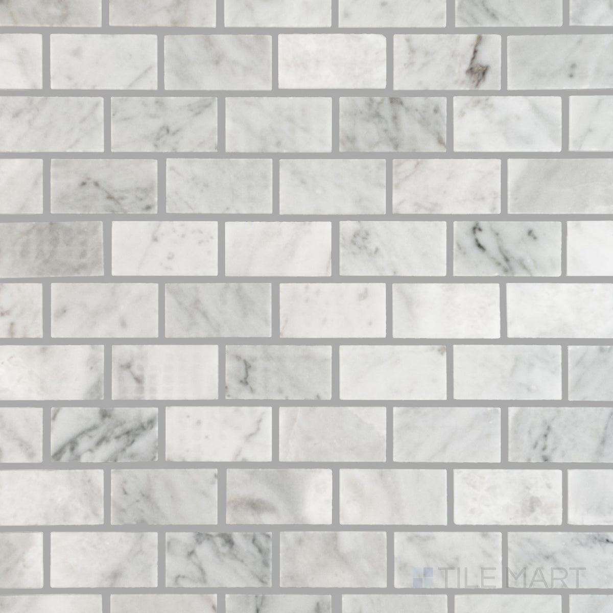 A polished finish enhances the natural veining of this 1x2 brick-patterned White Carrara marble mosaic. With a 12x12 layout, it offers a classic aesthetic perfect for floors, accent walls, and luxurious shower surrounds.