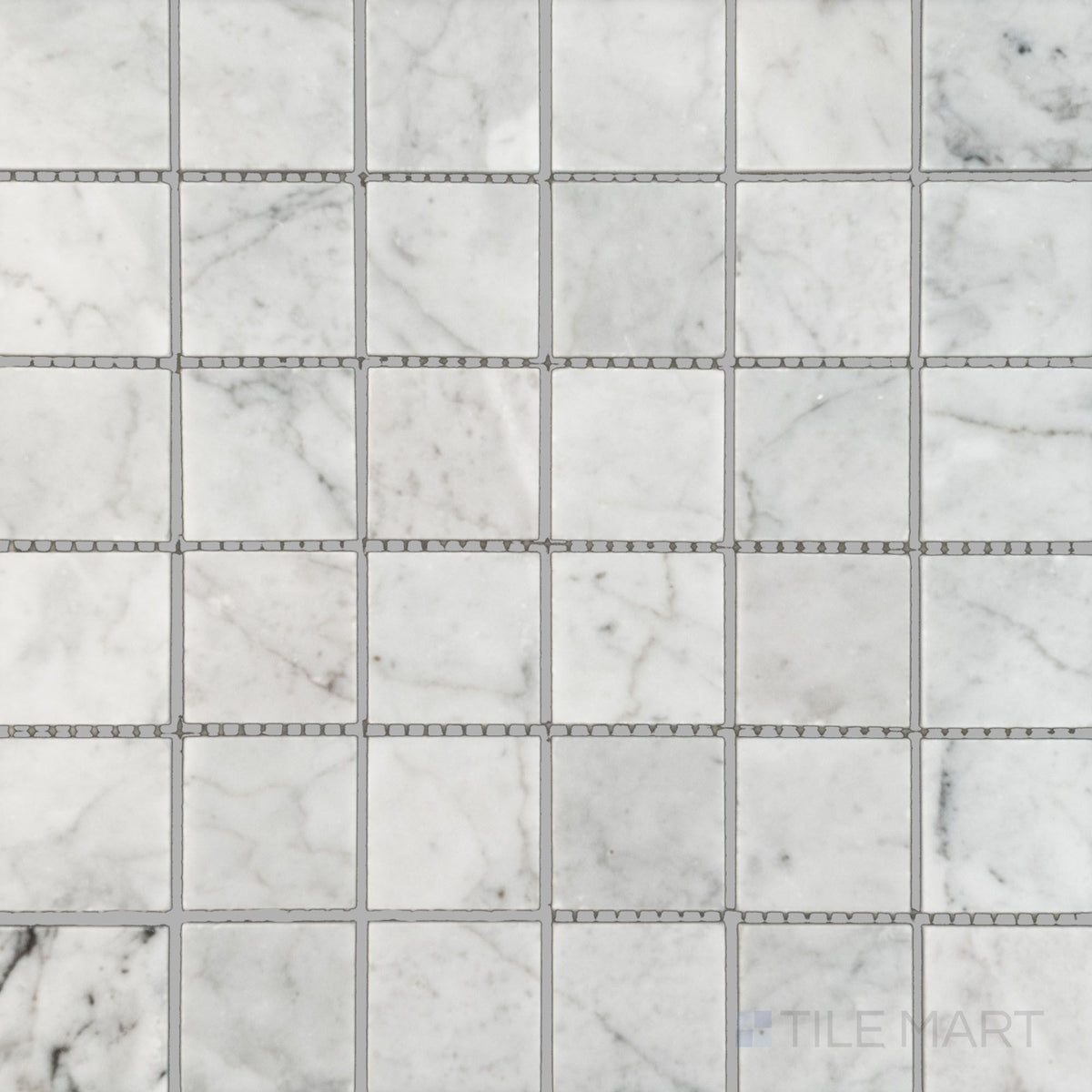 For a bold yet refined look, this polished 2" square White Carrara marble mosaic offers crisp edges and a glossy surface. The 12x12 format allows for effortless elegance in both residential and commercial settings.