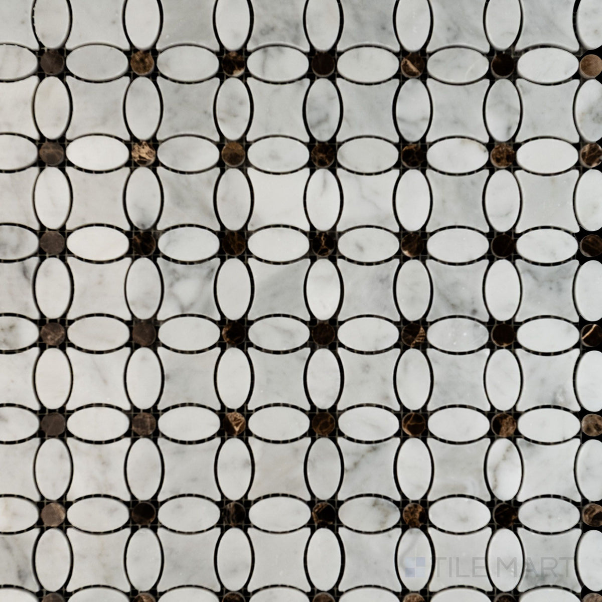 • Polished Emperador Dark details highlight the White Carrara Marble flower mosaic in this top-down image, ideal for classic and modern tile applications.