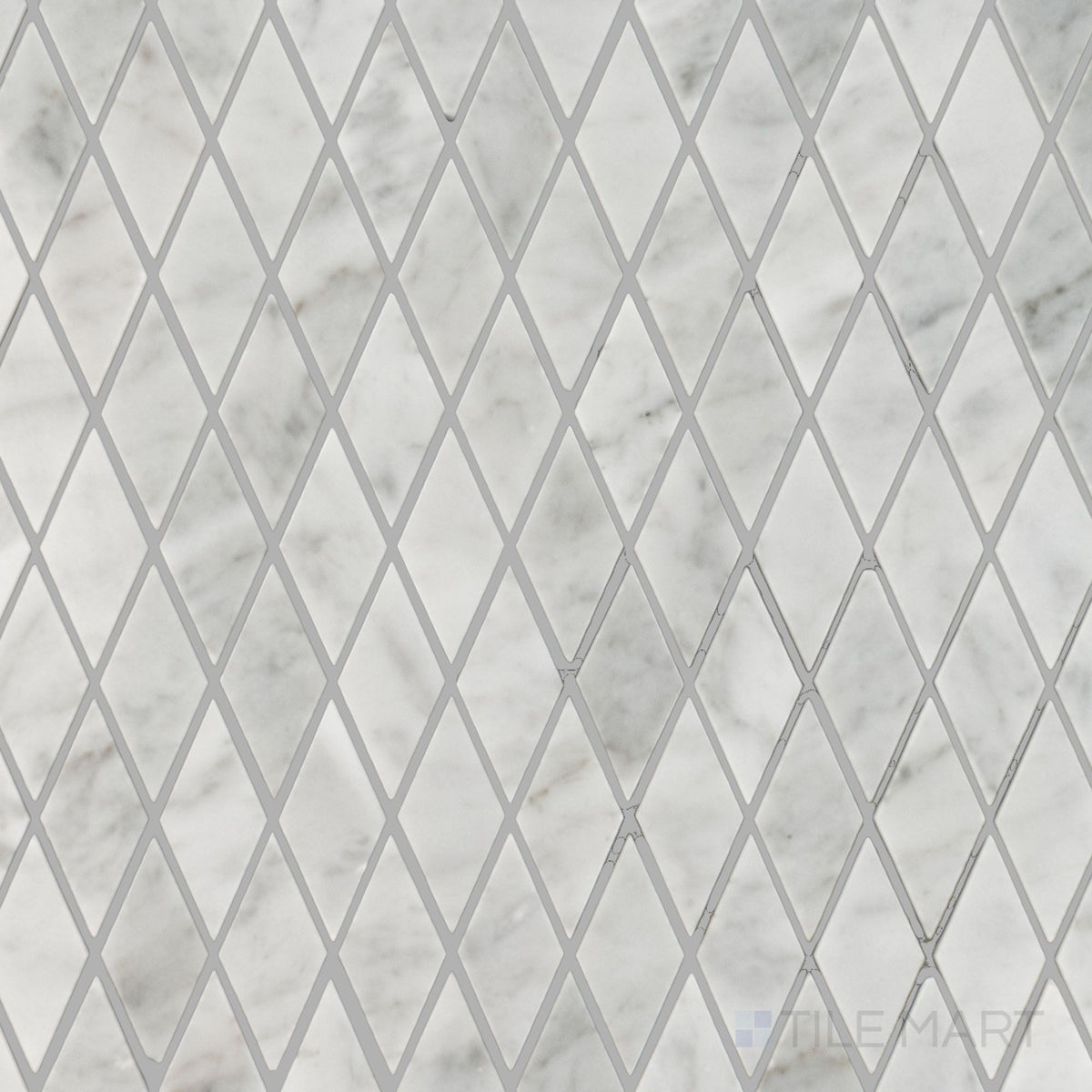 A polished finish enhances the bold angles of this 1x2 rhomboid White Carrara marble mosaic, offering a high-end, three-dimensional effect. The 9-3/4x10-1/2 layout makes it a standout feature in modern kitchens, luxurious bathrooms, and architectural design elements.