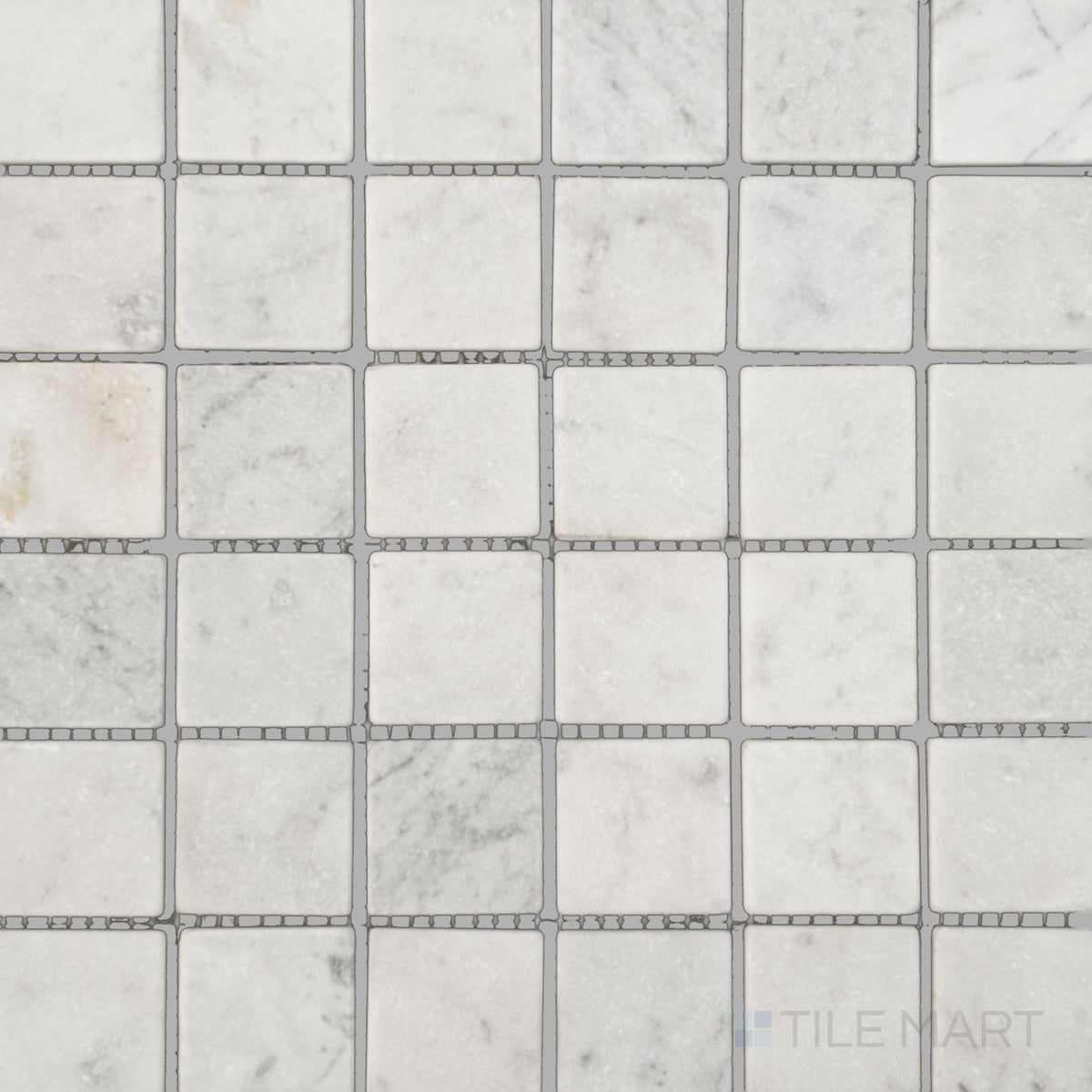 A tumbled finish brings a rustic, aged quality to this 2" square White Carrara marble mosaic, making it perfect for vintage and natural-inspired interiors. The 12x12 layout provides a seamless, textured look for both walls and floors.